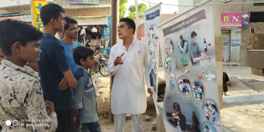 Bhilwara ( Rajasthan ): The local centre of the Brahma Kumaris, RK Colony, Bhilwara, conducted a number of de-addiction programmes at various places through road shows and short plays enacted by child artists. Highlighting the harmful consequences of tobacco — the root cause of TB, throat cancer, and lung cancer — the young artists displayed short plays at various places including RC Vyas Labour Square, Badla Square Shastri Nagar, Sanganeri Gate Square and for nursing students of MG Hospital.