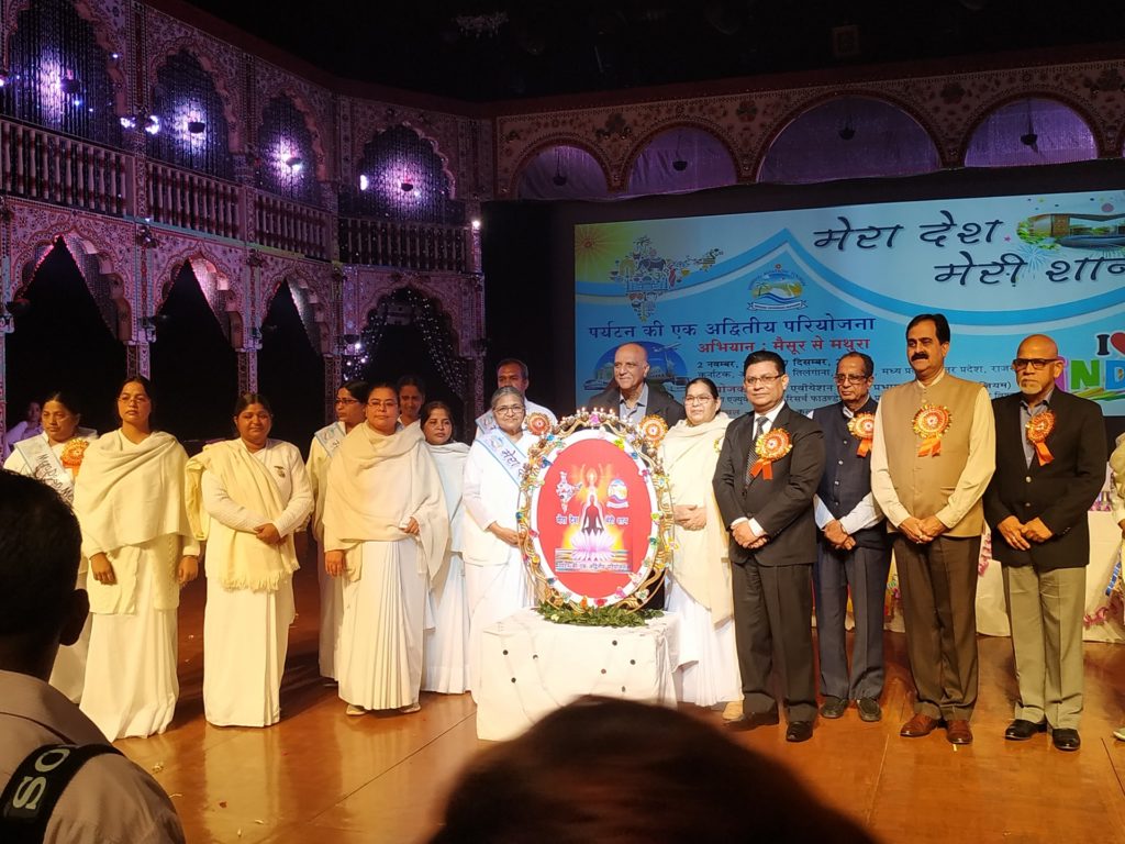 प्रजापिता ब्रह्मा कुमारी ईश्वरीय विश्व विद्यालय आर्ट गैलरी म्यूजियम , आगरा में ‘मेरा देश, मेरी शान‘ पर्यटन की एक अद्वितीय परियोजना अभियान पहुंचा। यह अभियान मैसूर से दिनांक 2 नवंबर 2019 से शुभारंभ हुआ है। जो आज आगरा शहर में पहुंचा है। कलाकृति कल्चर्स एंड कन्वेंशन सेंटर, आगरा में एक मंचीय कार्यक्रम हुआ। कार्यक्रम में सभी अतिथियों का स्वागत बी.के. माला बहनजी, बी.के वंदना बहन, बी.के संगीता बहन जी ने फूल, माला व वेज पहनाकर किया। कार्यक्रम में मुख्य अतिथी अरुण डेग पूर्व अध्यक्ष टूरिस्ट गिल्ड , सचिव उ.प्र. होटल & रेस्टॉरेन्टने ब्रह्माकुमारीज के सभी अभियान यात्रियों को बधाई देते हुए कहा कि ‘ ‘ ‘मेरा भारत मेरी शान’ पर्यटन की अद्वितीय योजना को बढ़ावा देने का कार्य संस्था द्वारा किया जा रहा है। यह एक प्रशंसनीय सराहनीय कार्य है । ऐसा करने से हमारे देश का गौरव और बढ़ जाएगा। हम भी आगरा म्यूजियम के साथ व टूरिज्म विंग के साथ मिलकर काम करना चाहेंगे।